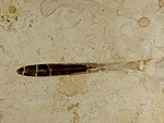 Hibolithes semisulcatus (MUENSTER, 1830) (syn. H. hastatus MONTFORT). Oberer Oberjura; Oberkimmeridge (Nusplinger Plattenkalk; Beckeri-Zone; Quenstedts Weißjura epsilon). Klassische Lokalität: Nusplingen auf dem Heuberg, Zollernalb-Kreis, Schwäbische Alb/Baden-Württemberg. Rostrum 4,7 cm, auf Plattenkalk ca. 10 x 8 cm. |