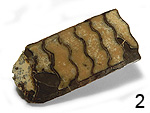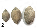 Insektenlarven. Oberkreide; Obermaastricht (Hell Creek Formation). Östliches Zentral-Montana/U.S.A. Besonderheit: Dreidimensional erhalten; spindelförmig; mit deutlicher Querstreifung. Sehr selten. Larve 2: 2 cm; Spitze fehlt. Larve 2: 1,5 cm; ein Längsteil der Spindel fehlt. |