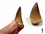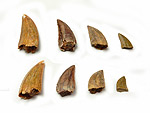 Deltadromeus agilis SERENO et al., 1996. Raptorzahn von Dinosauriern der Ceratosauria. Oberkreide; Obercenoman (Baharyia Formation, Gebel Dist Member). Taouz, marokkanische Sahara/Marokko. Mit feingezähnelten Schneidekanten; in Größen von 1,0 cm ( 4: € 20.- ), 1,4 cm ( 3: € 27.- ), 1,9 cm ( 2: € 34.- ) und 2,3 cm ( 1: € 38.- ). (Preishinweis: 2,5-cm-Zähne werden in den USA zwischen 80 bis 100 US $ angeboten.) Bitte die gewünschte Nummer/Größe angeben. |