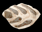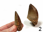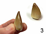 Mosasaurus beaugei ARAMBOURG, 1952. Squamata, Lacertilia. Mosasaurier-Zähne. Oberkreide; Maastricht. Khouribga, Oued Zem E Ouled-Abdoun-Becken/Marokko. Schmelz-erhaltene Zahnkronen. Einzelstücke. MosaB1: 4,2 cm, € 22.- MosaB2: 5,3 cm, € 24.- MosaB3: 3 cm, € 13.- |