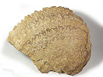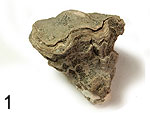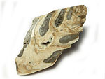 "Stromatolithe". Oberkreide; Cenoman (Tegana-Formation). "Saf-Saf, Nähe Erfoud"/Marokko. Kegelförmiges Exemplar, Durchmesser ca. 9 cm bei ca. 6 cm Höhe. Unterseite zwiebelschalenartig abrasiv freigewittert. Die Stromatolithen-Natur wird nicht allgemein anerkannt. Eine Entstehung als Sedimentstrukturen ist aber nicht erklärbar. Bei der Fossilisation und Umwandlung in Sandstein gingen alle Strukturen verloren; Schliffbilder bringen also keine Klarheit. € 33.- |
