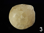 Echinosphaerites aurantium (GYLLENHAAL, 1772). Cystoiden-Kelche; die berühmten „Kristalläpfel“. Mittelordoviz; Llanvirn (Aseri-Horizont). Wolchow-Fluss bei Sankt Petersburg/Russland. Teils Analpyramide, Stiel und Mundsockel erhalten; teilweise Ausfüllung des ehemaligen Körperhohlraumes mit (durchscheinenden) Calcitskalenoedern; die Grenze zum sedimentgefüllten Gehäuseinnenraum ist eine geologische Wasserwaage („Geopetal-Gefüge“); oberflächlich mit partiellen Anwitterungen (siehe Fotos).