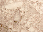 Alveolina cf. oblonga (ORB.). Eozän; Ypres (Cuis), Moussoulens W Carcassonne, Dép. Aude/F. Polierter Alveolinenkalk, bestehend durchwegs aus Alveolinen und anderen Foraminiferen (u.a. Orbitolites ) in calcitischer klarer Grundmasse. Scheiben 5,5 x 6,5 cm. Feinbau der rund 3 - 5 mm messenden Alveolinen und sonstigen Foraminiferen hervorragend erkennbar. € 14.- |