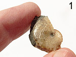 Hoploscaphites cf. criptonodosus (RICC.) (Mikrokonch). Oberkreide; Campan (Bearpaw Shale). Glendive, Montana/U.S.A. Perlmuttschale sehr abgegriffen. Mikrokonch mit weitgehend erhaltenem Endhaken, ca. 5 cm. € 43.- |