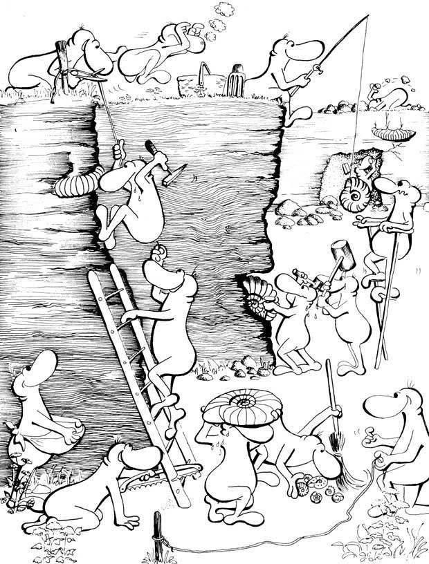 "Buntes Exkursionstreiben". Zeichnung Gabo Richter. Motivierung Die Zielsetzung unserer Exkursionen ist vielfältig. Priorität aber haben immer die Vermittlung geologischer, stratigraphischer und paläontologischer Eigenarten der jeweils besuchten Landschaften und das Sammeln von Fossilien und Gesteinen. Darüber hinaus vermitteln wir Ihnen fachliches Basiswissen bzw. ergänzen und vertiefen vorhandenes Wissen. Das Kennenlernen von Schicht und Fossil tagsüber im Gelände wird je nach Veranstaltung durch Präparationshinweise, Bestimmungsübungen, abendliche Vorträge und Aussprachen über Gesammeltes, Gesehenes und Gelerntes ergänzt. Da jeder gerne "Handgreifliches" mit nach Hause nehmen will, ist das Sammeln von Fossilien sehr wichtig. Unsere Funde - zuhause präpariert bzw. formatisiert und nach bestem Wissen bestimmt - ermöglichen zusammen mit den während der Exkursion gewonnenen Kenntnissen auch fazielle und ökologische Aussagen über die untersuchten Sedimente, entsprechendes Interesse vorausgesetzt. Neben diesen Hauptzielen unserer Fahrten versuchen wir, Ihnen soviel wie möglich von Land und Leuten zu zeigen. Dazu gehören natürlich auch Kultur- und Kunstgeschichte. Die Besichtigung von "Sehenswürdigkeiten" vermittelt uns die Kenntnis kultureller, geschichtlicher oder landschaftlicher Besonderheiten. Der Besuch natur- und geowissenschaftlicher Museen leitet wieder über zu unserem Hauptanliegen: Dem Kennen- und Verstehenlernen von Geologie und Paläontologie. In jedem Fall hat die im Kreise Gleichgesinnter verbrachte Exkursionszeit ganz sicher einen hochwertigen "Entstressungs-Effekt". Die Lösung vom Alltag und der Einfluss vielfältiger Eindrücke und Anregungen haben einen hohen Erholungswert trotz teils langer und - je nach individuellem Einsatz - mitunter auch anstrengender Geländetage. Wenn Sie bisher noch nicht mit uns gereist sind, so machen Sie einen Versuch! Die Tatsache, dass 95 % der bei uns erstmalig mitgefahrenen Gäste erneut teilnehmen, spricht für sich. Exkursionsablauf Die