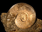 Pleydellia fluitans (DUMORTIER, 1874). Ammonit. Unterjura; Obertoarc (Aalensis-Zone). Berühmte Lokalität: Steinbruch von Lafarge Ciments, Usine du Val d'Azergues, in Belmont-d'Azergues/Département Rhône (mitunter wird auch der Ort Lozanne als Fundort genannt); ca. 17 km NW von Lyon. Durchmesser ca. 5,2 cm, auf Gestein 9 x 7 cm; Schalenerhaltung. € 32.- |