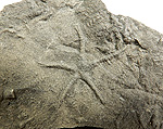 Palaeocoma egertoni (BROD.). Schlangenstern auf Gestein (Platte ca. 14 x 7 cm, hauchdünn aber sehr stabil). Oberpliensbach (margaritatus-Zone; Starfish Bed). Bridport, Dorset/GB. Wie gefunden; 4 deutlich erkennbare Schlangensterne mit unterschiedlichen Armlängen. € 53.- Siehe „FOSSILIEN“ 4/1990. |