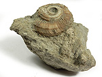 Platyclymenia sp. Altammonit. Oberdevon; Unterfamenne. Marokko an der Grenze zu Béni Abbès/Algerien. Teiweise beschalt, 8 cm, rückseitig auf Gestein aufsitzend. Altfund von 1988. Sehr attraktiv. € 38.- |